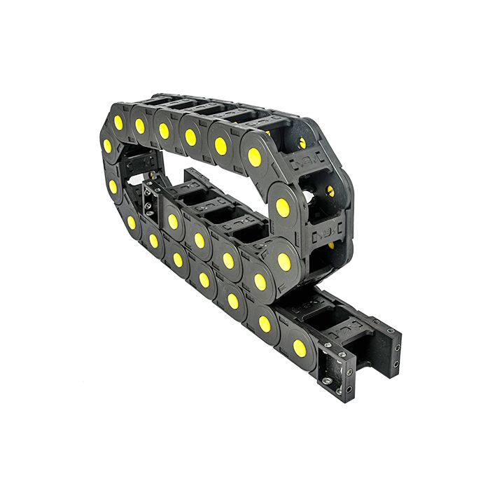2、机床工程拖链各节都能打开,有利于安装和维修。运动时噪音低、耐磨损、可髙速运动。